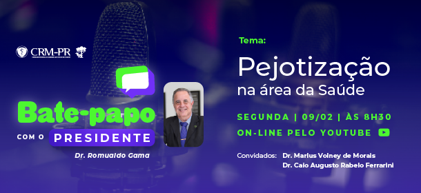 A conversa com o presidente do CRM-PR, Dr. Romualdo Gama, será transmitida na próxima segunda-feira, 9 de fevereiro, às 8h30, com a participação dos doutores Marlus Volney de Morais, presidente do SIMEPAR e Caio Augusto Rabelo Ferrarini
