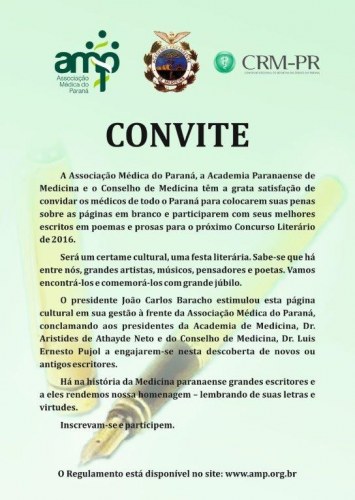 As inscrições para o Concurso Literário 2016 foram prorrogadas até o dia 30 de agosto. O certame une a Associação Médica do Paraná, Academia Paranaense de Medicina e Conselho Regional de Medicina do Paraná. São duas categorias literárias – prosa e poesia -, sendo o certame aberto a todos os médicos com atuação no Paraná e também acadêmicos de todas as escolas de Medicina do Estado. Não há necessidade de ineditismo, e os candidatos podem concorrer com até dois trabalhos.